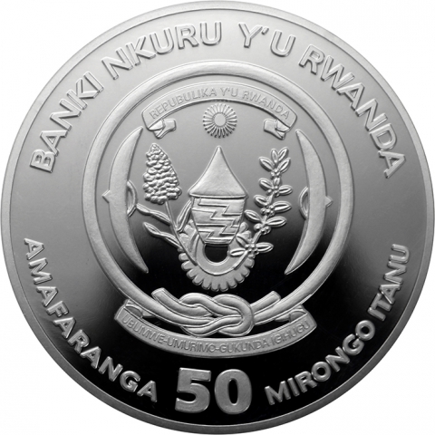 Il rovescio della moneta raffigura, con il classico stile mosaico, un topo seduto a sinistra, in alto il carattere cinese corrispondente al segno; nel campo Year of the Rat, attorno Lunar Ounce - 2020 - 1 oz fine silver 999. Il diritto pone al centro lo stemma nazionale del Rwanda tra le scritte Banki Nkuru Y'u Rwanda in alto e Amafaranga 50 Mirongo Itanu in basso.