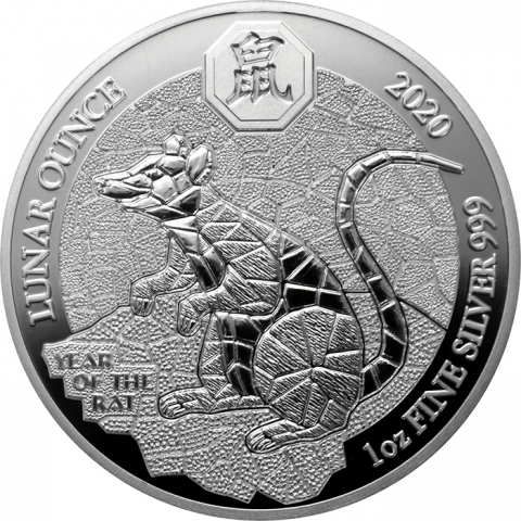 Il rovescio della moneta raffigura, con il classico stile mosaico, un topo seduto a sinistra, in alto il carattere cinese corrispondente al segno; nel campo Year of the Rat, attorno Lunar Ounce - 2020 - 1 oz fine silver 999.