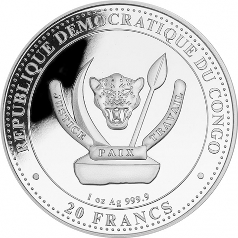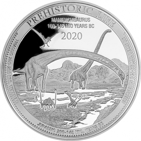 Terza emissione della nuova serie "Prehistoric Life" del Congo, dedicata alMamenchisaurus. La moneta mostra una coppia di questa specie nei pressi di uno specchio d'acqua; Il motivo è incorniciato dal titolo della serie "VITA PREISTORICA" e da una linea temporale che indica le epoche preistoriche Triassica, Giurassica e Cretacea. Il rovescio è caratterizzato dallo stemma della Repubblica Democratica del Congo. Questo dinosauro visse nel Giurassico superiore e si caratterizzava per un collo incredibilmente lungo, pari a circa la metà della lunghezza totale del suo corpo. Si è calcolato che poteva avere una lunghezza di 35 metri ed un peso tra le di 50 e le 70 tonnellate.