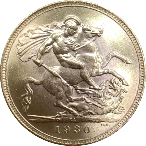 Sterlina in oro emessa sotto il regno di Giorgio V e coniata dalla zecca sudafricana di Pretoria. Mostra sul diritto il profilo del Re e sul rovescio il celebre San Giorgio che uccide il drago. Segno di zecca SA. Moneta di altissima qualità, praticamente FDC.