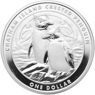 La moneta è dedicata ad un animale neozelandese estinto: il Pinguino crestino dell'isola di Chatham. Il rovescio della moneta raffigura una coppia di pinguini in piedi sulla roccia in mezzo al turbolento oceano. Sullo sfondo è visibile un simbolo Maori, che rappresenta il ricco e affascinante patrimonio della cultura nativa della Nuova Zelanda. Sul dritto della moneta è raffigurato il profilo della Regina Elisabetta II di Ian Rank-Broadley, attorno il paese di emissione, la purezza del metallo e l'anno di emissione.