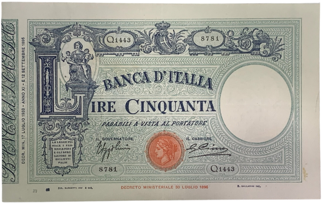 Biglietto di Banca da 50 Lire "Matrice - fascio" emesso nel 1933 durante il regno di Vitorio Emanuele III. Mostra sul dritto a sinistra una figura femminile a rappresentare l'Arte, seduta su una grande L e con due putti sulle braccia. In alto lo stemma sabaudo. Al retro una figura femminile a rappresentare il Disegno con braciere e due putti. Banconota di buona qualità, a nostro parere qSUP.