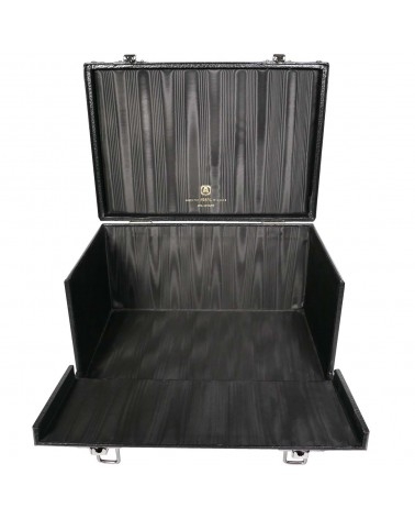 Capiente bauletto in legno rivestito in similpelle con interni in raso e cuscino imbottito. Apertura anteriore ribaltabile e maniglia in alto, interamente realizzato in Italia. Adatto per ospitare fino a 20 ripiani formato standard in floccato o 14 ripiani in velluto. Fornito senza ripiani.