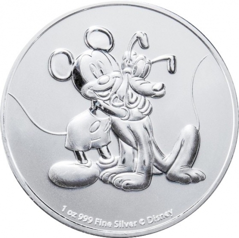 Il rovescio della moneta raffigura Topolino e Pluto che si abbracciano. In basso l'indicazione del metallo, titolo e logo Disney.