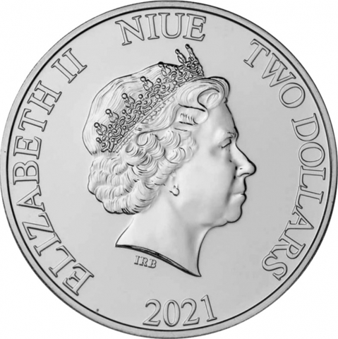 Terza emissione della serie "Lion King" ideata per ricordare il 25° anniversario del lungometraggio omonimo. Tratto dal montaggio musicale di Hakuna Matata, la moneta mostra Simba insieme ai suoi amici Timon e Pumbaa, cammina su un tronco d'albero caduto. Il design include anche il logo Disney. Il diritto mostra il ritratto della Regina Elisabetta II e le iscrizioni "DUE DOLLARI", "ELIZABETH II", "2021" e "NIUE".