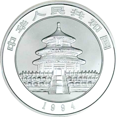 Decima emissione della serie Panda. La moneta del 1994 mostra un panda gigante seduto ed intento a mangiare del bambu. La serie di monete cinesi denominata Panda inizia nel 1983. Nei primi due anni prodotte nella sola versione proof, successivamente anche nella versione Bullion FDC, queste splendide monete mostrano sempre sul rovescio il simpatico animale nel suo habitat naturale. Da notare che fino al 2015 tutte le monete cinesi erano organizzate secondo l'oncia, multipli e frazioni, nel 2016 si è passati al grammo. Il dritto raffigura un’immagine del Tempio del Cielo a Pechino e l'anno di emissione.
