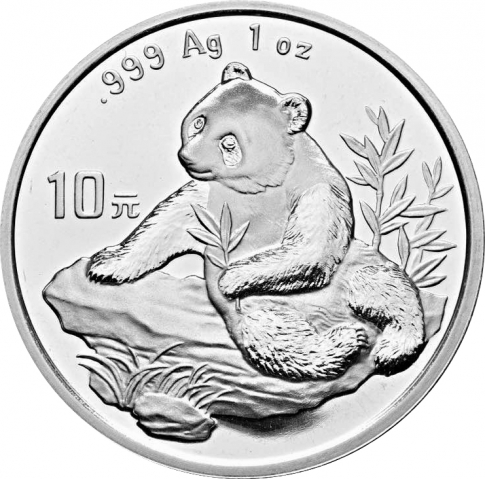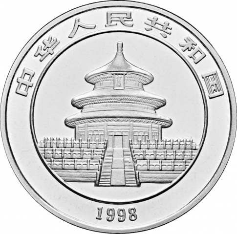 Quattordicesima emissione della serie Panda. La moneta del 1998 mostra un panda gigante seduto con la zampa tesa in appoggio su una roccia. La serie di monete cinesi denominata Panda inizia nel 1983. Nei primi due anni prodotte nella sola versione proof, successivamente anche nella versione Bullion FDC, queste splendide monete mostrano sempre sul rovescio il simpatico animale nel suo habitat naturale. Da notare che fino al 2015 tutte le monete cinesi erano organizzate secondo l'oncia, multipli e frazioni, nel 2016 si è passati al grammo. Il dritto raffigura un’immagine del Tempio del Cielo a Pechino e l'anno di emissione.
