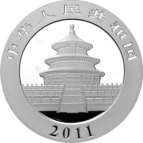Ventisettesima emissione della serie Panda. La moneta del 2011 mostra un panda gigante con il suo cucciolo nel loro habitat naturale. La serie di monete cinesi denominata Panda inizia nel 1983. Nei primi due anni prodotte nella sola versione proof, successivamente anche nella versione Bullion FDC, queste splendide monete mostrano sempre sul rovescio il simpatico animale nel suo habitat naturale. Da notare che fino al 2015 tutte le monete cinesi erano organizzate secondo l'oncia, multipli e frazioni, nel 2016 si è passati al grammo. Il dritto raffigura un’immagine del Tempio del Cielo a Pechino e l'anno di emissione.