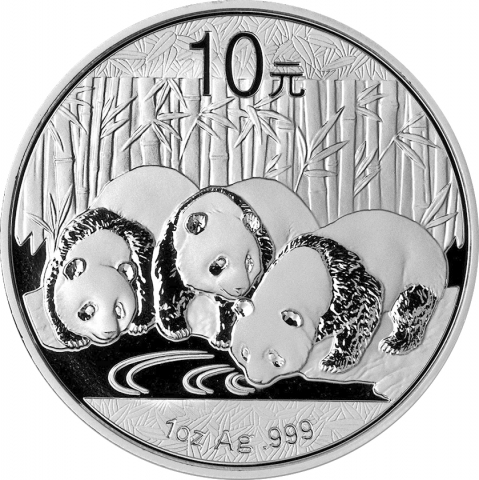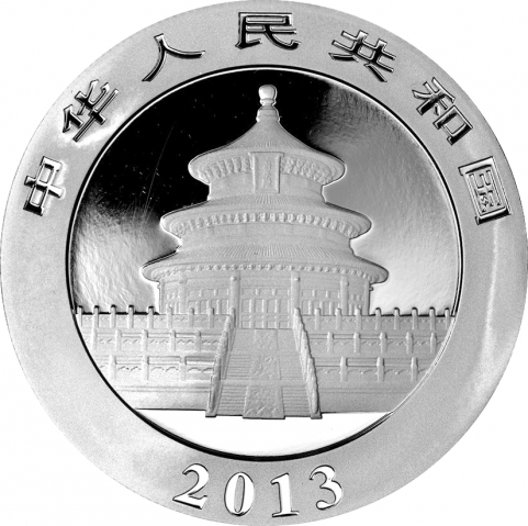 Ventinovesima emissione della serie Panda. La moneta del 2013 mostra tre panda che si abbeverano in un corso d'acqua. La serie di monete cinesi denominata Panda inizia nel 1983. Nei primi due anni prodotte nella sola versione proof, successivamente anche nella versione Bullion FDC, queste splendide monete mostrano sempre sul rovescio il simpatico animale nel suo habitat naturale. Da notare che fino al 2015 tutte le monete cinesi erano organizzate secondo l'oncia, multipli e frazioni, nel 2016 si è passati al grammo. Il dritto raffigura un’immagine del Tempio del Cielo a Pechino e l'anno di emissione.