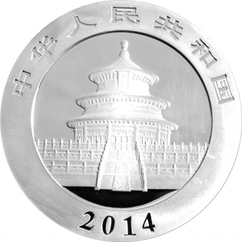 Trentesima emissione della serie Panda. La moneta del 2014 mostra un panda seduto che tiene un bastone. La serie di monete cinesi denominata Panda inizia nel 1983. Nei primi due anni prodotte nella sola versione proof, successivamente anche nella versione Bullion FDC, queste splendide monete mostrano sempre sul rovescio il simpatico animale nel suo habitat naturale. Da notare che fino al 2015 tutte le monete cinesi erano organizzate secondo l'oncia, multipli e frazioni, nel 2016 si è passati al grammo. Il dritto raffigura un’immagine del Tempio del Cielo a Pechino e l'anno di emissione.
