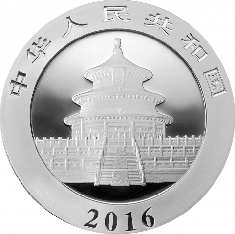Trentaduesima emissione della serie Panda. La moneta del 2016 mostra un panda abbracciato ad un grosso ramo d'albero. La serie di monete cinesi denominata Panda inizia nel 1983. Nei primi due anni prodotte nella sola versione proof, successivamente anche nella versione Bullion FDC, queste splendide monete mostrano sempre sul rovescio il simpatico animale nel suo habitat naturale. Da notare che fino al 2015 tutte le monete cinesi erano organizzate secondo l'oncia, multipli e frazioni, nel 2016 si è passati al grammo. Il dritto raffigura un’immagine del Tempio del Cielo a Pechino e l'anno di emissione.