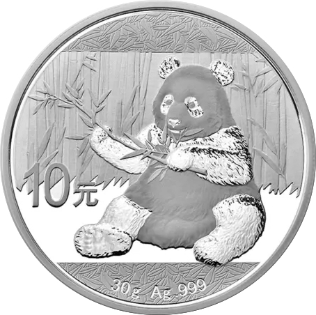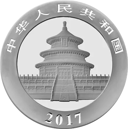 Trentatreesima emissione della serie Panda. La moneta del 2017 mostra un panda seduto che tiene tra lke zampe un ramoscello di bambu. La serie di monete cinesi denominata Panda inizia nel 1983. Nei primi due anni prodotte nella sola versione proof, successivamente anche nella versione Bullion FDC, queste splendide monete mostrano sempre sul rovescio il simpatico animale nel suo habitat naturale. Da notare che fino al 2015 tutte le monete cinesi erano organizzate secondo l'oncia, multipli e frazioni, nel 2016 si è passati al grammo. Il dritto raffigura un’immagine del Tempio del Cielo a Pechino e l'anno di emissione.