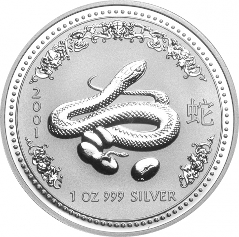 Terza emissione della serie "Lunar I" dedicata al segno zodiacale del Serpente. La moneta lo mostra sul rovescio vicino alle sue uova. Ai suoi lati la data di emissione ed il carattere cinese corripondente al segno.