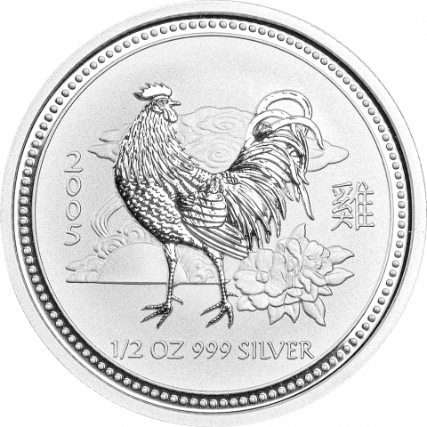 Settima emissione della serie "Lunar I" dedicata al segno zodiacale del Gallo. La moneta la mostra sul rovescio verso sinistra mentre si volta a destra. Ai suoi lati la data di emissione ed il carattere cinese corripondente al segno.