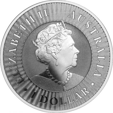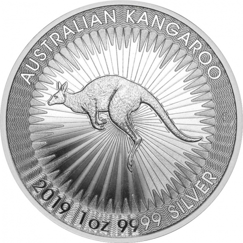 Quinta emissione per la serie Australian Silver Kangaroo. Queste monete del 2019 mostrano il canguro in primo piano mentre il campo della moneta è riempito da linee radiali a raggiera.