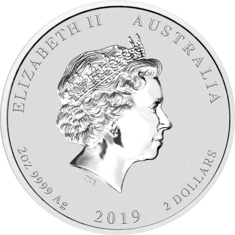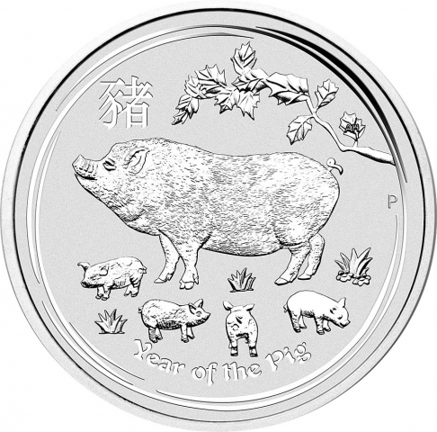 La dodicesima ed ultima emissione della serie "Lunare II" mostra un maiale con i suoi cuccioli che giocano in un ambiente rurale. La moneta ricorda il segno zodiacale lunare del maiale, e le persone nate sotto questo segno si dice che siano leali, sincere e calme. L’inscrizione "Anno del maiale" è incisa sul bordo inferiore, il carattere cinese pinyin sta a simboleggiare il famoso marchio di zecca "P". Il dritto della moneta reca il ritratto della regina Elisabetta II, opera di Sir Ian Rank-Broadley, comunemente usato nella moneta a corso legale del paese.