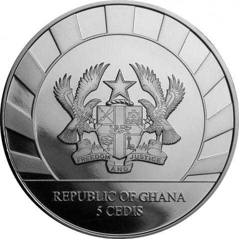 Terza emissione della serie Giants of the Ice Age, animali enormi che abitavano le terre nell'era glaciale e dedicata al Megaloceros del Grande Corno, estintosi durante il Quaternario. I reperti fossili coprono il periodo dal Pleistocene superiore a circa 9000 anni fa e sono diffusi in tutta l'Eurasia e nel Nordafrica. Sono inoltre visibili le immagini di tutti gli animali che compongono la serie e le informazioni sull'anno di emissione, il peso della moneta ed il titolo dell'argento. Sul diritto figurano lo stemma del Ghana e l'iscrizione "Repubblica del Ghana" e le informazioni sul valore nominale.