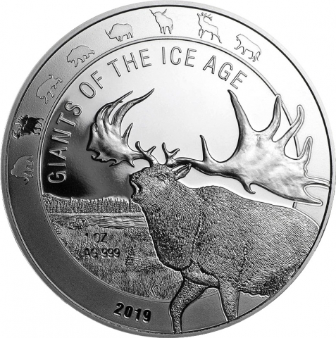 Terza emissione della serie Giants of the Ice Age, animali enormi che abitavano le terre nell'era glaciale e dedicata al Megaloceros del Grande Corno, estintosi durante il Quaternario. I reperti fossili coprono il periodo dal Pleistocene superiore a circa 9000 anni fa e sono diffusi in tutta l'Eurasia e nel Nordafrica.