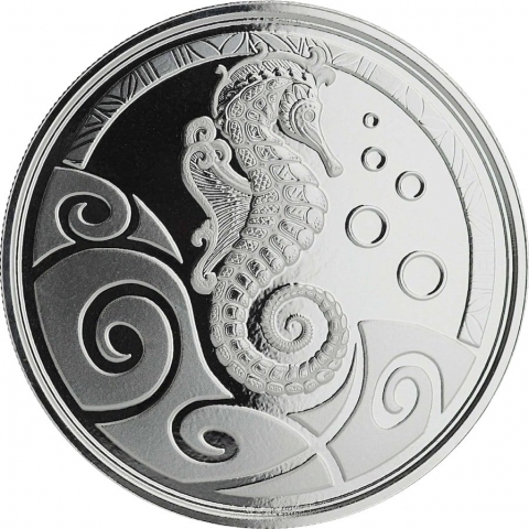 Seconda emissione dedicata all' Ippocampo. La moneta emessa dall'isola di Samoa mostra in primo piano un cavalluccio marino che cavalca la cresta di un onda nelle acque tropicali samoane, nello sfondo l'oceano con bolle.