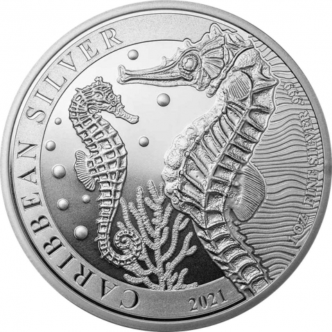 Quarta emissione della serie dedicata all'Ippocampo. La moneta raffigura una coppia di cavallucci marini nel loro habitat naturale, nello sfondo un alga e bolle d'aria che salgono in superficie. Di lato una grafica composta da onde. Il cavalluccio marino è originario delle acque tropicali che circondano le Barbados e può essere trovato più spesso nelle foreste di mangrovie e nei letti di erbe marine dell'oceano. Il disegno include anche la scritta "Caribbean Silver", l'anno di emissione ed il titolo. Il rovescio mostra lo stemma delle Barbados.