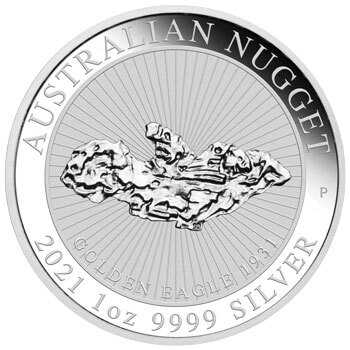 Terza emissione della serie Australian Nugget della zecca di Perth, coniata in argento puro in qualità BUe dedicata alla scoperta della pepita Golden eagle (Aquila dorata), chiamata così per la sua notevole somiglianza con un uccello rapace in volo. Golden Eagle fu scoperta dal figlio diciassettenne del cercatore James Larcombe al culmine della Grande Depressione nel gennaio 1931 vicino a Widgiemooltha, una piccola città 630 chilometri a est di Perth. Con un peso di 1.136 once (35,3 kg), la sensazionale scoperta rimane la pepita più grande che sia stata dissotterrata nell'Australia occidentale. La pepita è raffigurata sul motivo della moneta ed è compresa dalle iscrizioni "Australian Nugget", "Golden eagle 1931" e "2021 1oz 9999 SILVER". Il rovescio della moneta mostra il ritratto di Sua Maestà la Regina Elisabetta II e il valore nominale.