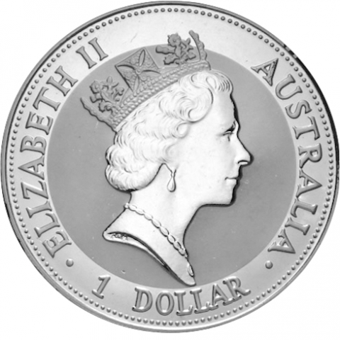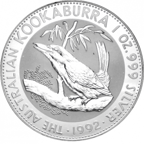 Terza emissione della serie kookaburra. In questa moneta datata 1992 l'uccello viene raffigurato su un ramo mentre emette il suo classico verso. L'animale conosciuto con il nome di "Laughing Hans" o "Hunter Liest", vive principalmente nella parte orientale dell'Australia e ha un caratteristico organo vocale. Il nome Kookaburra è una modifica del termine aborigeno australiano "guuguubarra", che evoca il richiamo del martin pescatore. La scritta AUSTRALIAN KOOKABURRA si curva attorno al bordo superiore, mentre la data, il peso e la purezza della moneta si possono vedere alla base. Il dritto raffigura l'effigie della regina Elisabetta II.