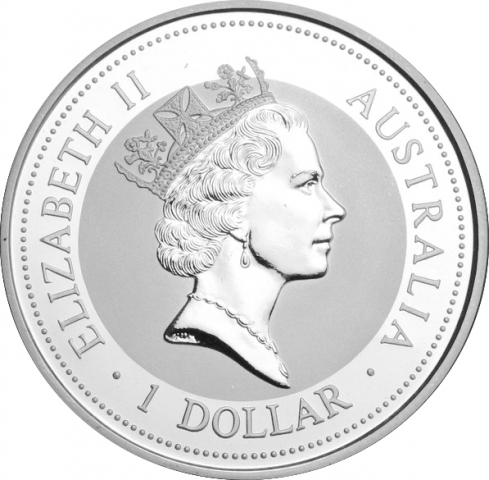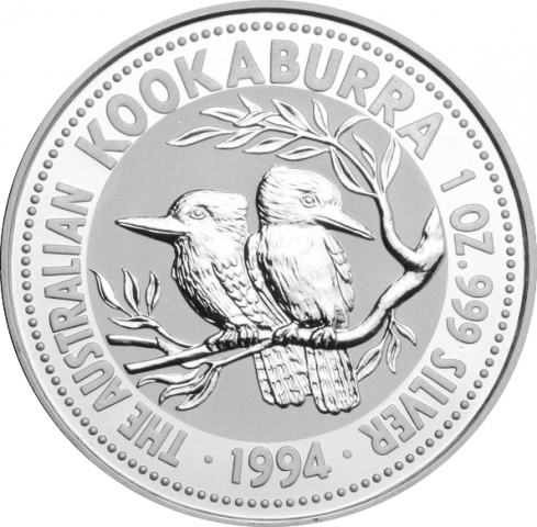 Quinta emissione della serie kookaburra. In questa moneta datata 1994 vengono raffigurati in coppia su un ramo di albero. L'animale conosciuto con il nome di "Laughing Hans" o "Hunter Liest", vive principalmente nella parte orientale dell'Australia e ha un caratteristico organo vocale. Il nome Kookaburra è una modifica del termine aborigeno australiano "guuguubarra", che evoca il richiamo del martin pescatore. La scritta AUSTRALIAN KOOKABURRA si curva attorno al bordo superiore, mentre la data, il peso e la purezza della moneta si possono vedere alla base. Il dritto raffigura l'effigie della regina Elisabetta II.
