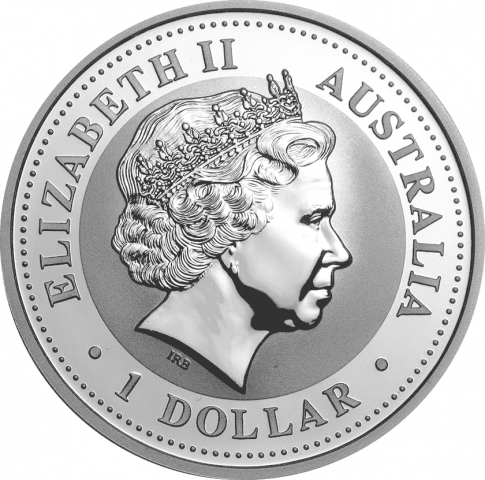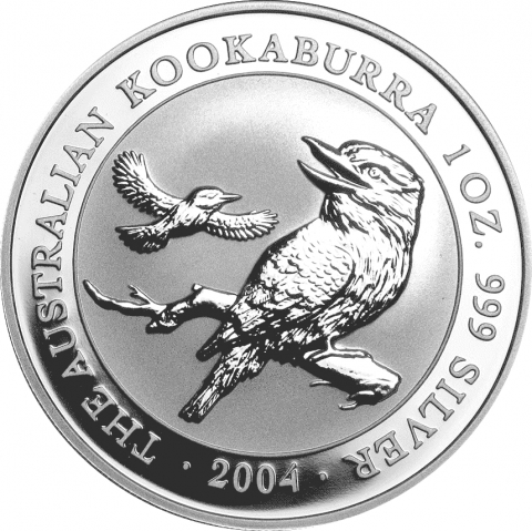 Quindicesima emissione della serie kookaburra. In questa moneta datata 2004 è raffigurato un uccello kookaburra appollaiato su un ramo e un altro in volo sullo sfondo. L'animale conosciuto con il nome di "Laughing Hans" o "Hunter Liest", vive principalmente nella parte orientale dell'Australia e ha un caratteristico organo vocale. Il nome Kookaburra è una modifica del termine aborigeno australiano "guuguubarra", che evoca il richiamo del martin pescatore. La scritta AUSTRALIAN KOOKABURRA si curva attorno al bordo superiore, mentre la data, il peso e la purezza della moneta si possono vedere alla base. Il dritto raffigura l'effigie della regina Elisabetta II.