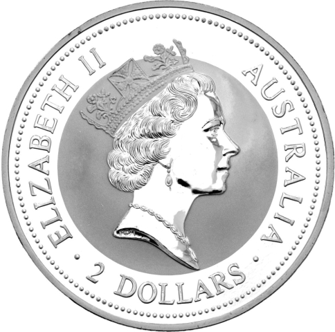 Sesta emissione della serie kookaburra da 2 once. In questa moneta datata 1996 l'uccello viene raffigurato in volo verso destra. L'animale conosciuto con il nome di "Laughing Hans" o "Hunter Liest", vive principalmente nella parte orientale dell'Australia e ha un caratteristico organo vocale. Il nome Kookaburra è una modifica del termine aborigeno australiano "guuguubarra", che evoca il richiamo del martin pescatore. La scritta AUSTRALIAN KOOKABURRA si curva attorno al bordo superiore, mentre la data, il peso e la purezza della moneta si possono vedere alla base. Il dritto raffigura l'effigie della regina Elisabetta II.