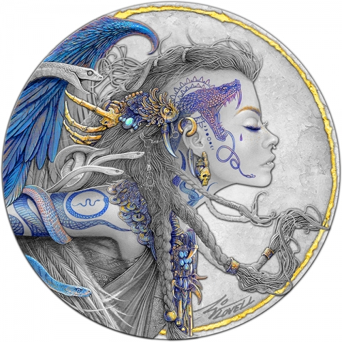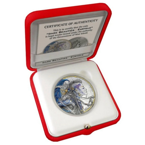 Quarta emissione della serie "Dark Beauties" e dedicata alle illustrazioni fantasy "Euryale" di Christopher Lovell. Christopher Lovell è un artista del Regno Unito, le cui influenze sono iniziate molto presto nella sua infanzia, dove ha sviluppato un profondo interesse per il fantasy e la fantascienza. I giocattoli, i cartoni animati e i film dell'epoca lo hanno incantato, alimentando la sua immaginazione, che lo ispira ancora oggi. La moneta, realizzata con uno stile vintage, mostra sul rovescio Euryale, personaggio della mitologia greca, una delle tre Gorgoni e sorella di Medusa, immortale e dal grido acutissimo