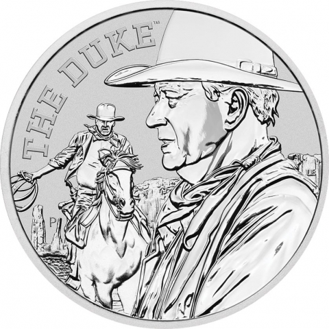 John Wayne è stato uno degli attori più noti del cinema americano e mondiale, dirigendo e prodecendo più di 170 film in una carriera lunga diverse decine di anni. la moneta mostra l'attore di profilo con il suo caratteristico cappello da cowboy. Il disegno include anche il suo soprannome "THE DUKE" e il tradizionale marchio di zecca "P" della zecca di Perth Mint. Si tratta di una delle monete meno comuni del 2020 perchè coniata in soli 15.000 esemplari. Il diritto raffigura la regina Elisabetta II, con la scritta "QUEEN ELIZABETH II 1 1oz 9999 Ag 2020 TUVALU 1 DOLLAR".