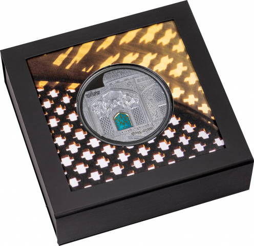 Inserita nella serie Tiffany Art la moneta è dedicata alla meraviglia architettonica di Naghsh-e Jahan Square a Isfahan, in Iran, conosciuta anche come Piazza dell'Imam. Patrimonio dell'Umanità dell'Unesco, è una delle più grandi piazze del mondo e un tesoro di architettura e arte persiana. Il rilievo altamente dettagliato rende onore all'architettura della Moschea Sheikh Lotfollah che si trova sul lato est della piazza della città. Con i suoi magnifici archi e le sue opere in tegole, stupisce tutti i visitatori. Nella moneta è visibile un inserto in vetro in stile Tiffany con lamine in oro, splendidamente integrato nel design. La tecnologia Smartminting© ha permesso di combinare straordinari dettagli a rilievo con una finitura nera impeccabile per un risultato mozzafiato.