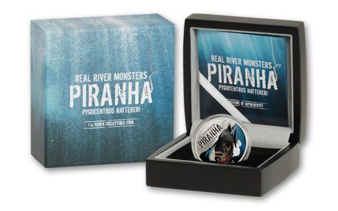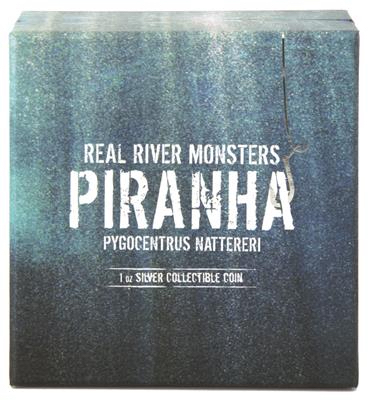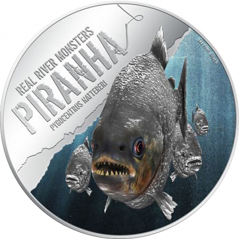 Moneta commemorativa in argento inserita nella serie Real River Monsters e dedicata al Piranha, pesce d'acqua dolce onnivoro che abita i fiumi sudamericani, noto per i suoi denti affilati e il suo appetito. La moneta lo mostra nel suo habitat naturale, mentre nuota con i suoi simili.