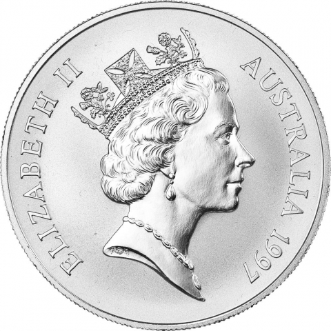 Quinta emissione della serie Australian Kangaroo che in questa edizione datata 1997 mostra un canguro mentre beve acqua mostrando nel contempo la sua immagine riflessa. Il rovescio presenta il ritratto della Regina Elisabetta II nel campo della moneta ed atttorno la scritta: ELIZABETH II AUSTRALIA 1997.