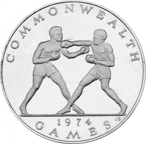 Moneta commemorativa coniata per i 10° Giochi del Commonwealth del 1974. La moneta mostra due pugili che si sfidano in un incontro di boxe, attorno la scritta COMMONWEALTH 1974 GAMES. Moneta perfettamente conservata, a nostro parere FDC.