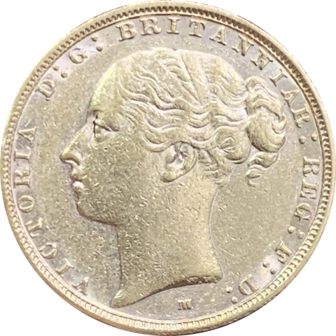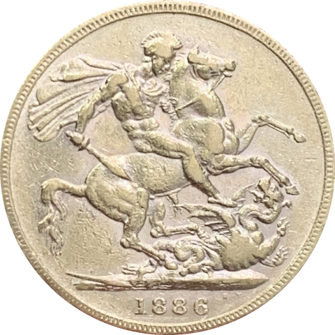 Moneta in oro da 1 sterlina emessa sotto il regno della Regina Vittoria e coniata dalla zecca coloniale di Melbourne. Mostra sul dritto il giovane volto della Regina Vittoria con i capelli raccolti e sul retro San Giorgio a cavallo che uccide il drago, in basso la data 1886. A nostro parere di conservazione qSPL.