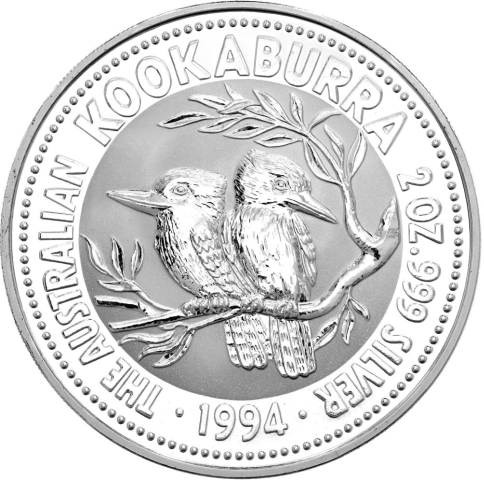 Quarta emissione della serie kookaburra da 2 once. In questa moneta datata 1994 vengono raffigurati in coppia su un ramo di albero. L'animale conosciuto con il nome di "Laughing Hans" o "Hunter Liest", vive principalmente nella parte orientale dell'Australia e ha un caratteristico organo vocale. Il nome Kookaburra è una modifica del termine aborigeno australiano "guuguubarra", che evoca il richiamo del martin pescatore. La scritta AUSTRALIAN KOOKABURRA si curva attorno al bordo superiore, mentre la data, il peso e la purezza della moneta si possono vedere alla base. Il dritto raffigura l'effigie della regina Elisabetta II.
