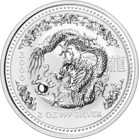Seconda emissione della serie "Lunar I" dedicata al segno zodiacale del Drago. La moneta lo mostra sul rovescio mentre afferra la perla. Ai suoi lati la data di emissione ed il carattere cinese corripondente al segno.