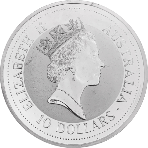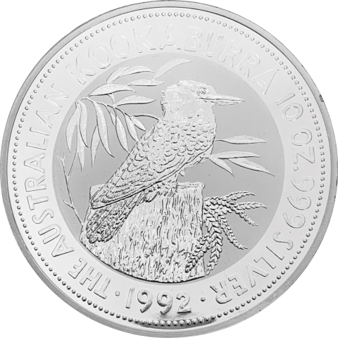 Prima emissione della serie kookaburra da 10 once. In questa moneta datata 1992 l'uccello viene raffigurato su un ramo. L'animale conosciuto con il nome di "Laughing Hans" o "Hunter Liest", vive principalmente nella parte orientale dell'Australia e ha un caratteristico organo vocale. Il nome Kookaburra è una modifica del termine aborigeno australiano "guuguubarra", che evoca il richiamo del martin pescatore. La scritta AUSTRALIAN KOOKABURRA si curva attorno al bordo superiore, mentre la data, il peso e la purezza della moneta si possono vedere alla base. Il dritto raffigura l'effigie della regina Elisabetta II.