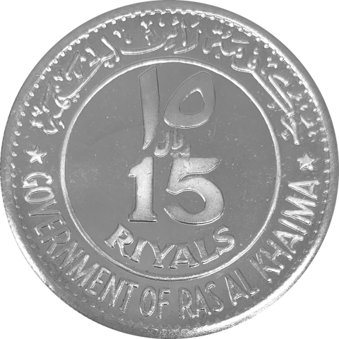 Moneta commemorativa in argento dedicata al centenario di Roma capitale d'Italia. Mostra sul diritto i busti accollati di Giuseppe Garibaldi, Giuseppe Mazzini e Aurelio Saffi, in esergo la Lupa capitolina con Romolo e Remo, attorno la scritta Roma 1870 - 1970. Sul rovescio il valore nominale nella lingua araba ريـَـال ١٥ e inglese 15 Riyals. Attorno la legenda in arabo حُكـومَة رأس الخـــيمة ed inglese Government of Ras Al Khaimah.