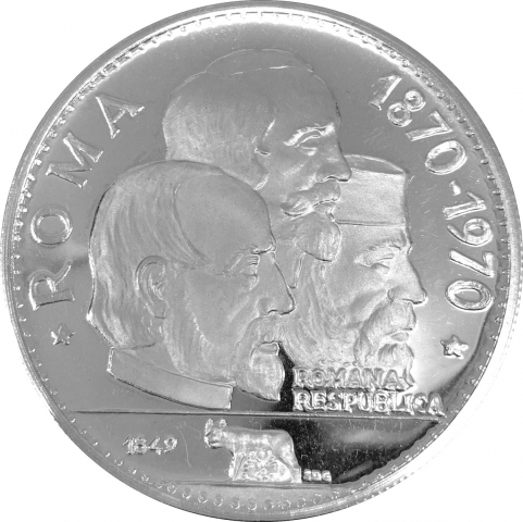 Moneta commemorativa in argento dedicata al centenario di Roma capitale d'Italia. Mostra sul diritto i busti accollati di Giuseppe Garibaldi, Giuseppe Mazzini e Aurelio Saffi.
