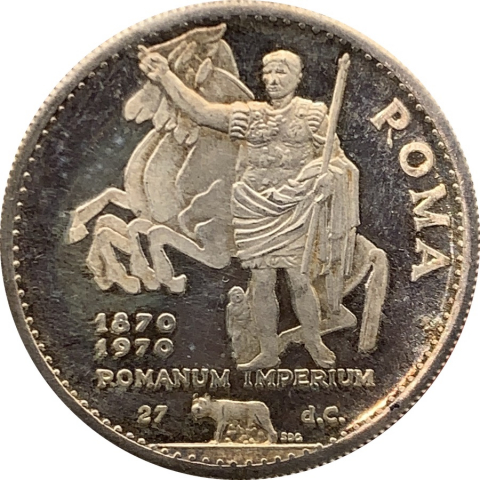 Moneta commemorativa in argento dedicata al centenario di Roma capitale d'Italia. Mostra sul diritto l'imperatore Augusto.