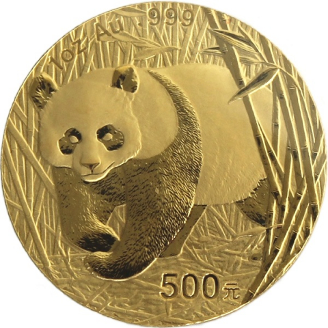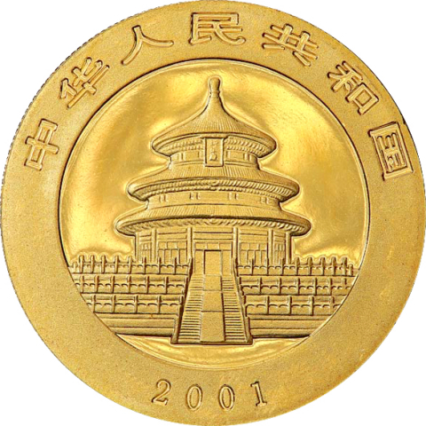 Moneta in oro dedicata al Panda. L'emissione del 2001, la ventesima della serie, lo mostra che cammina attraverso i bamboo. La serie di monete cinesi in oro denominata Panda inizia nel 1982. Nei primi due anni prodotte nella sola versione proof, successivamente anche nella versione Bullion FDC, queste splendide monete mostrano sempre sul rovescio il simpatico animale nel suo habitat naturale. Da notare che fino al 2015 tutte le monete cinesi erano organizzate secondo l'oncia, multipli e frazioni, nel 2016 si è passati al grammo. Il dritto raffigura un’immagine del Tempio del Cielo a Pechino e l'anno di emissione.