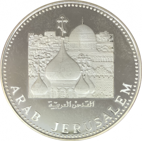 Moneta commemorativa in argento di largo modulo dedicata alla città di Gerusalemme, capitale proclamata dello Stato di Palestina. Mostra sul rovescio una veduta della città con la cupola della moschea in primo piano.