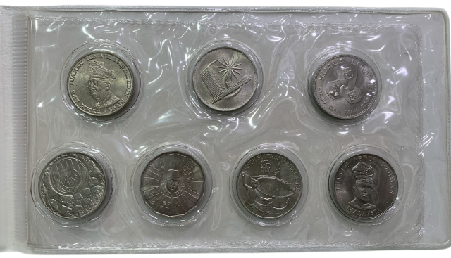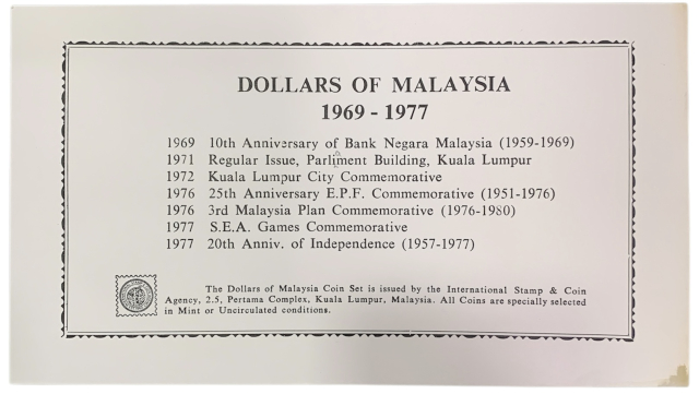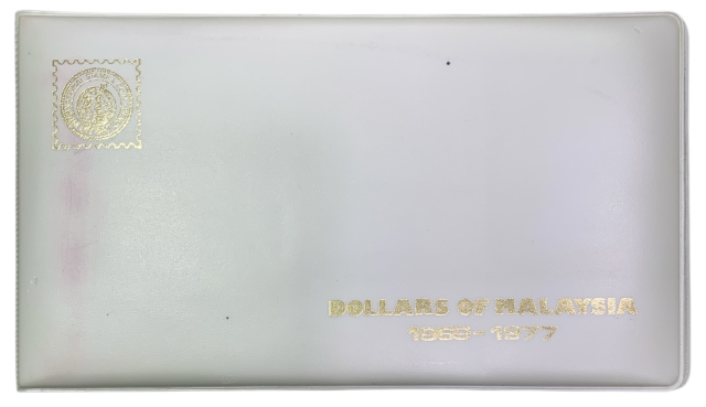 Set comprendente 7 monete da 1 dollaro malese (Ringgit) emesse dal 1969 al 1977, corredato di certificato di garanzia della Zecca. All'interno l'alloggiamento delle monete risulta lesionato in 4 posizioni ma le monete sono in perfetto stato di conservazione e prive di alcun minimo difetto.