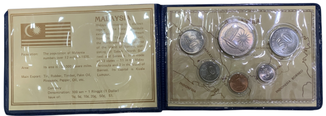 Set comprendente 6 monete per un valore complessivo di 1,86 dollari malesi emesse dal 1971 al 1978, corredato di cartoncino descrittivo. Il tutto in perfetto stato di conservazione.