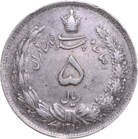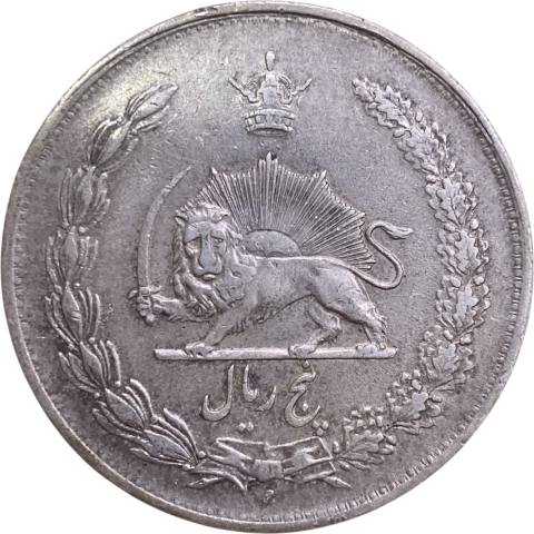 Moneta in argento coniata durante il regno di Rezā Pahlavī. Mostra sul dritto un leone di fronte a un sole raggiante a sinistra, che tiene una spada nella zampa anteriore destra; in basso l'iscrizione پنج ریال. Sul retro valore nominale entro rami di quercia e ulivo; in alto a sinistra l'iscrizione رضا شاه پهلوی شاهنشاه ایران. Moneta di discreta qualità con leggera patina, a nostro parere di conservazione BB.