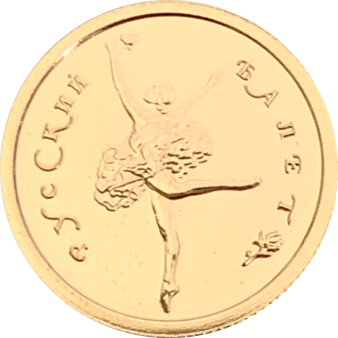 Moneta in oro dedicata al balletto russo che mostra una ballerina di danza classica, con l'iscrizione da sinistra a destra lungo il bordo: "РУССКИЙ БАЛЕТ" (BALLETTO RUSSO).