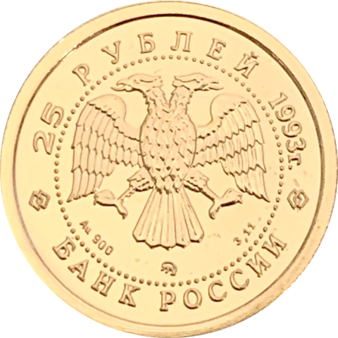 Moneta in oro dedicata al balletto russo che mostra una ballerina di danza classica, con l'iscrizione da sinistra a destra lungo il bordo: "РУССКИЙ БАЛЕТ" (BALLETTO RUSSO). Sul dritto è posto l'emblema della Banca di Russia e sotto il segno del metallo, il titolo, il marchio della zecca e il contenuto di metallo fine. Le iscrizioni lungo il bordo, incorniciate da un cerchio di punti: in alto - "25 РУБЛЯ 1993 г." (25 ROUBLES 1993), in basso "БАНК РОССИИ" (BANCA DI RUSSIA).