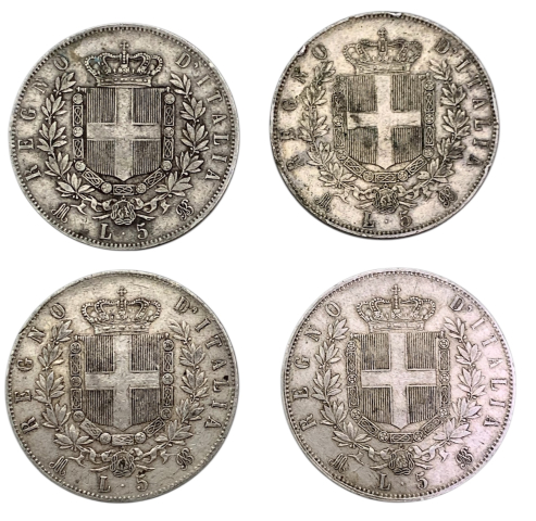 Lotto di 4 monete in argento emesse negli anni 1873 e 1874. Le monete mostrano tutte sul diritto testa nuda del re a destra, sotto il collo Ferraris, attorno in alto ad arco Vittorio Emanuele II, in basso la data. Sul rovescio Stemma crociato e coronato entro rami di alloro, in basso il collare dell'Annunziata. Attorno ad arco Regno d'Italia il segno di zecca ed il valore nominale. Monete di discreta qualità, a nostro parere di conservazione da qBB a BB+.